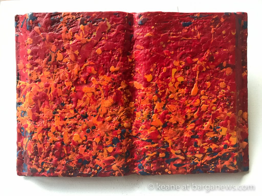 To compliment the wall-mounted paintings, several artist’s books provide a rich three-dimensional dialog between the works. I have fixed open actual books, allowing the open face of the book to be the painted surface—many incised with text.