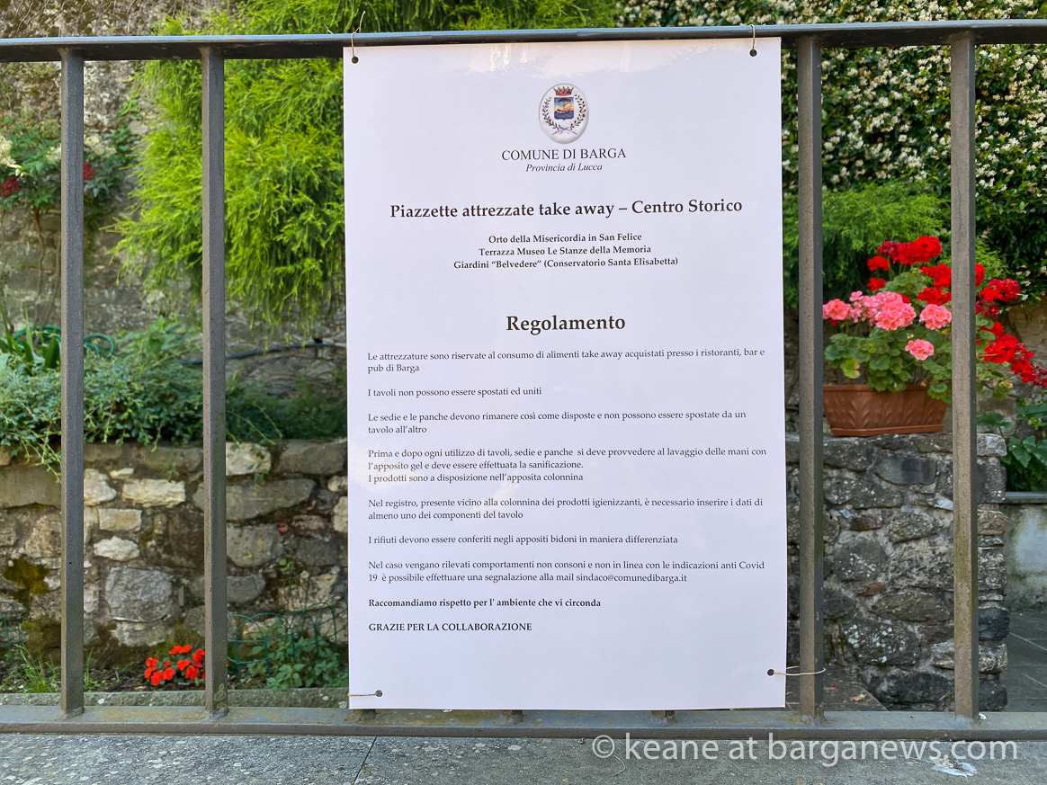 L’Amministrazione comunale di Barga proprio per favorire il lavoro dei tanti locali barghigiani, dentro e fuori l’antico Castello, ha predisposto un progetto per ospitare tutti i consumatori di take away.
