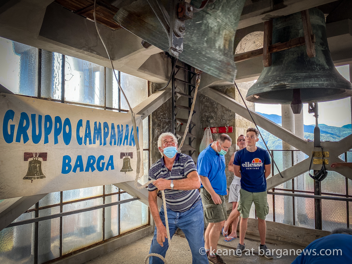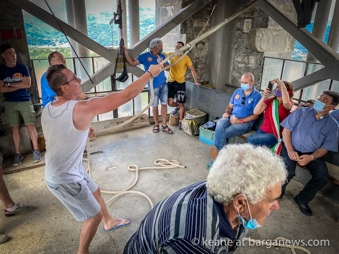 This morning there was a brief ceremony on top of the bell tower of the Duomo as the blue flag of Barga was raised over the city and the bells rung out their “doppio”