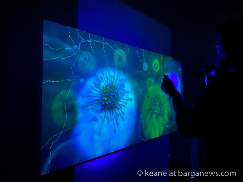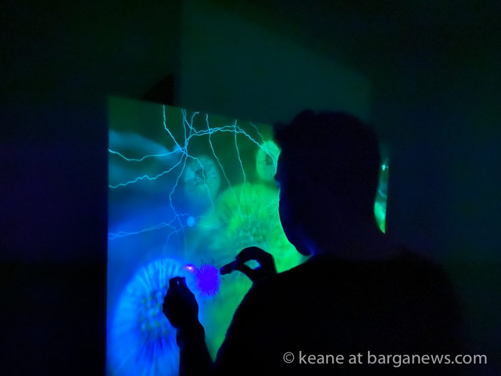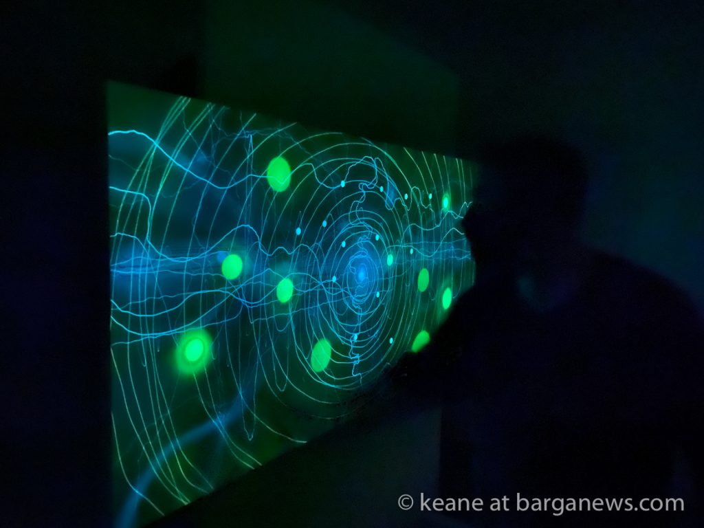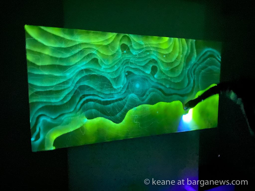 La tecnica qui trova spazio e si lega strettamente al messaggio, la luce uv imprimendosi sulla tela lascia tracce visibili solo per per 9 ore, poi come tutto nell’universo, cambia forma palesando l’essenza effimera della natura e del creato.