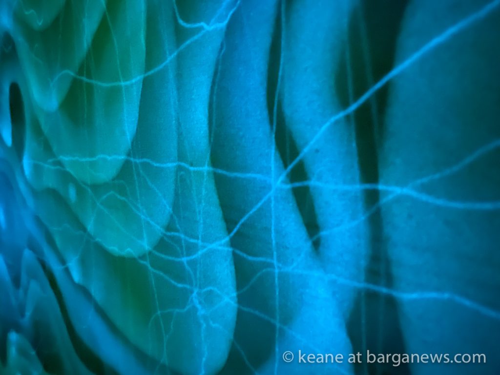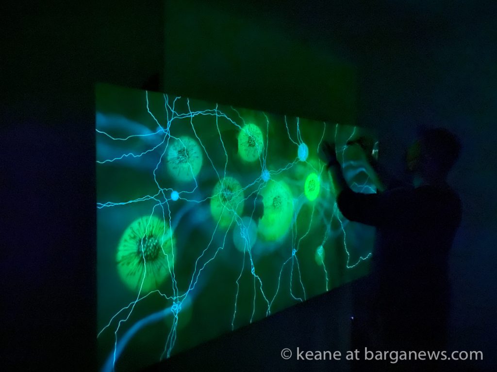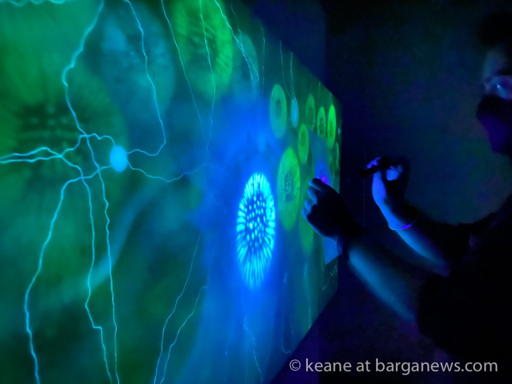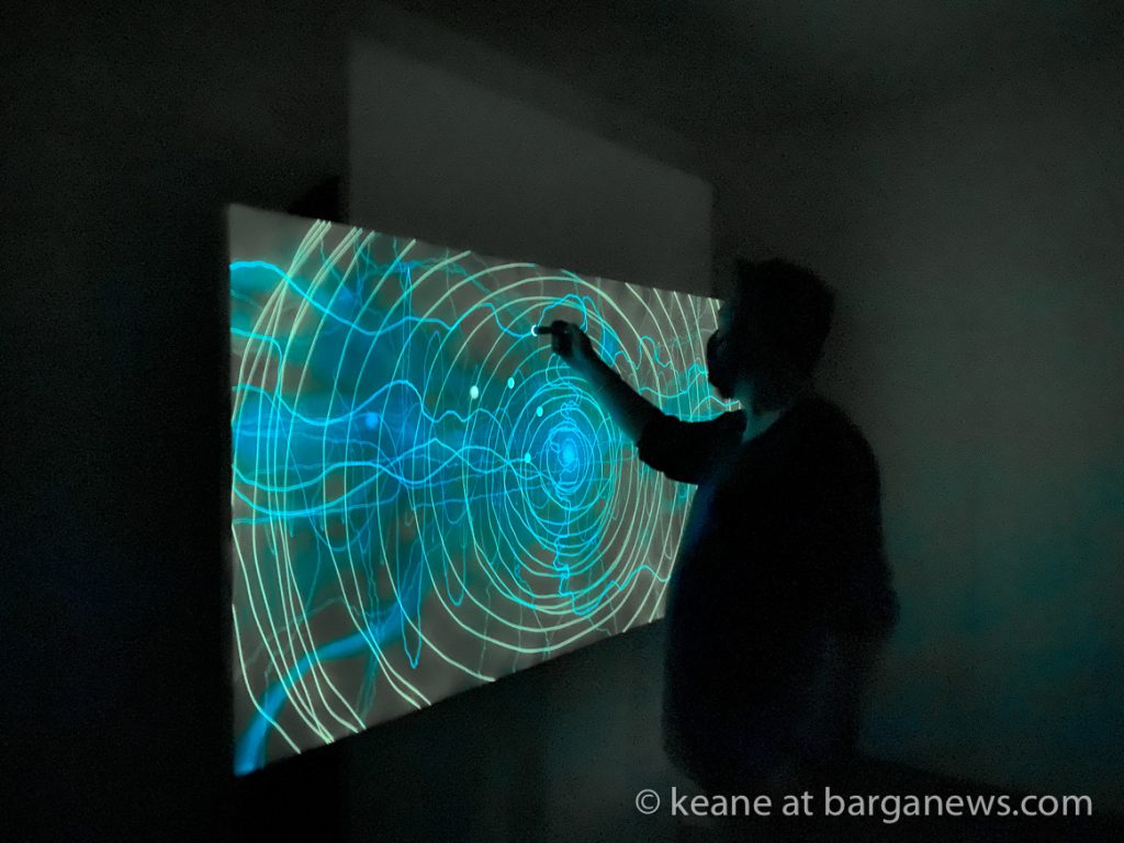 La tecnica qui trova spazio e si lega strettamente al messaggio, la luce uv imprimendosi sulla tela lascia tracce visibili solo per per 9 ore, poi come tutto nell’universo, cambia forma palesando l’essenza effimera della natura e del creato.