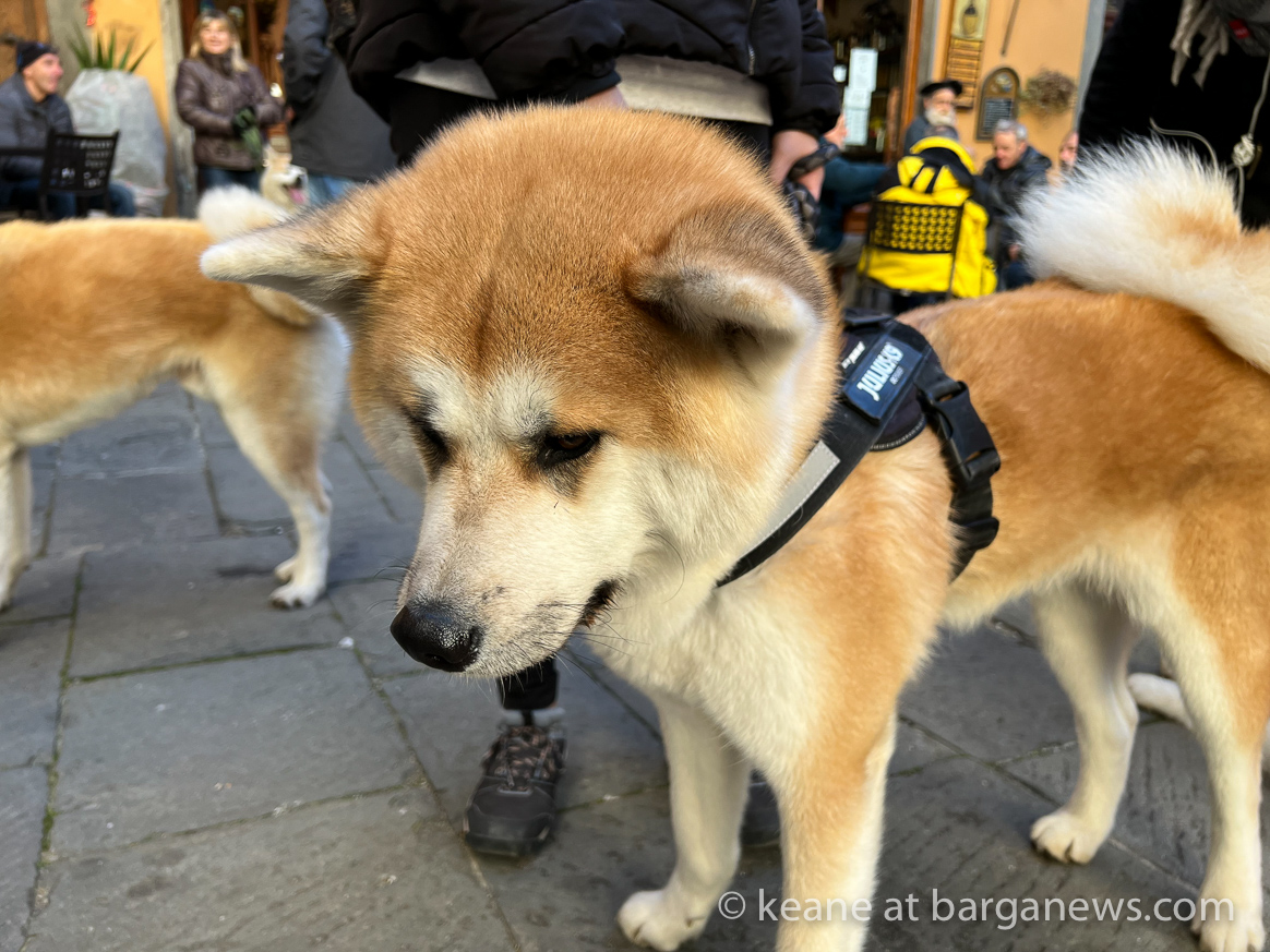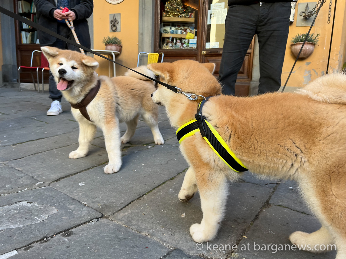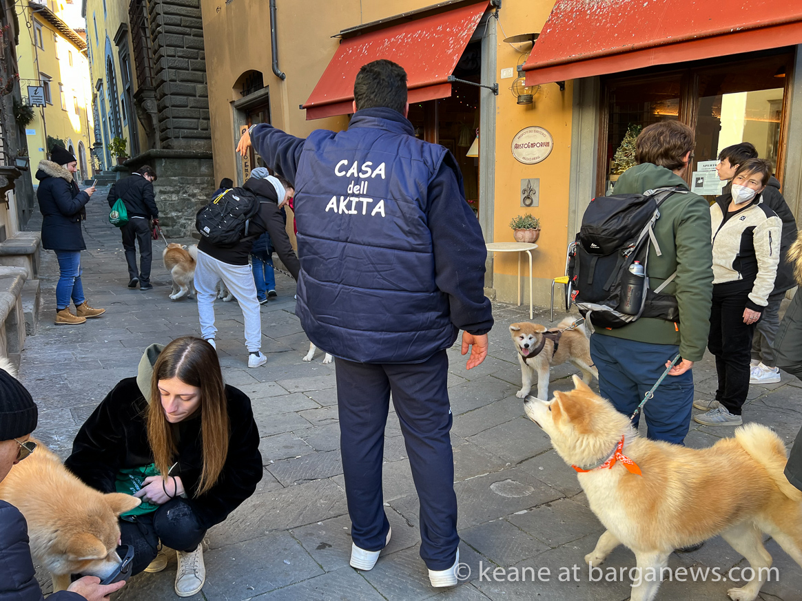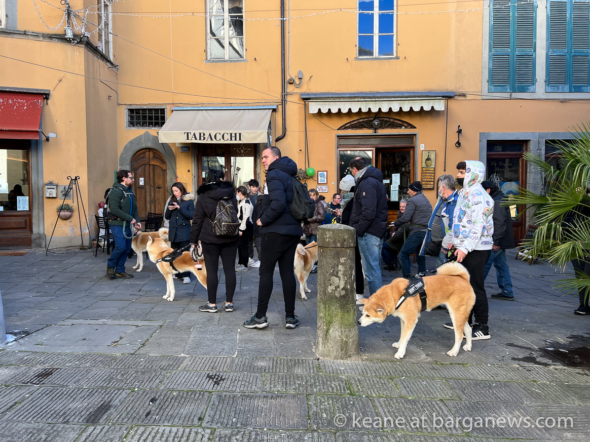 A group of Akita dogs visited Barga this morning, all born in Barga and ranging from 3 months old to 3 years old.