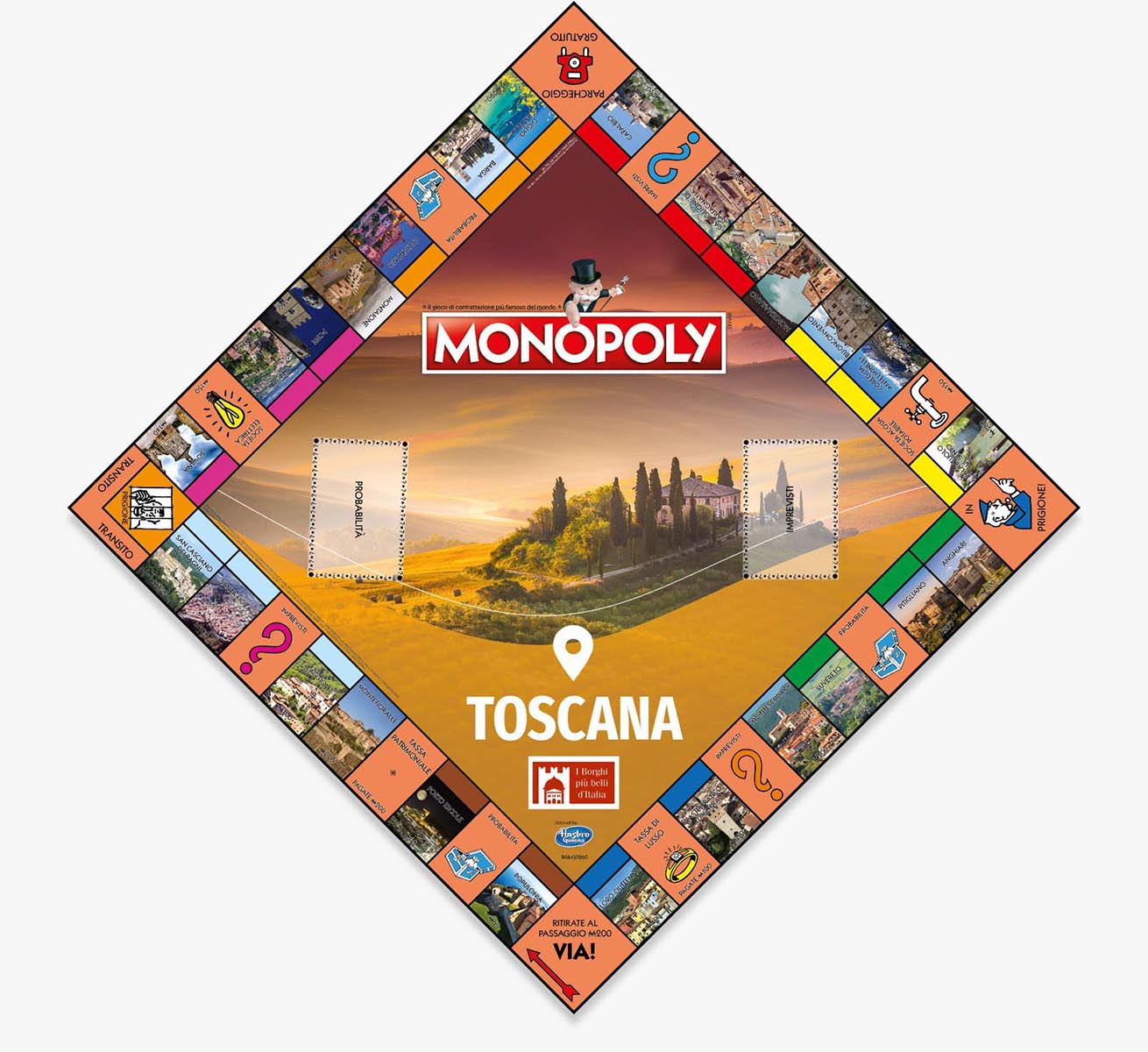 «Monopoly e l’Associazione de “I Borghi più belli d’Italia” ti accompagnano in un viaggio alla scoperta degli angoli più nascosti della Toscana. In questa versione di Monopoly le immagini dei piccoli “Borghi d’Italia” sostituiscono quelle classiche delle vie e piazze. Ristruttura vecchie case, sviluppa alberghi diffusi e vinci la partita!