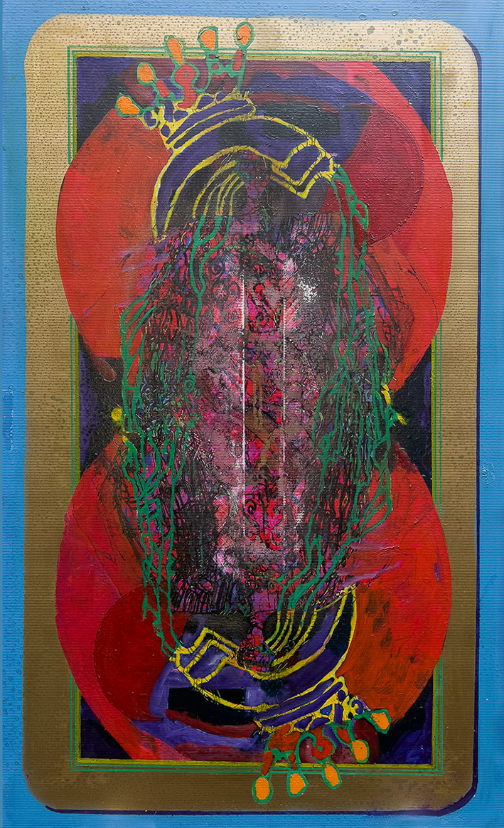 All paintings are oil paint, charcoal, acrylic, spray paint, chalk, marker pen on mixed media 60 cms x 100 cms . The rest of the series of paintings based around details of images from playing cards can be seen here