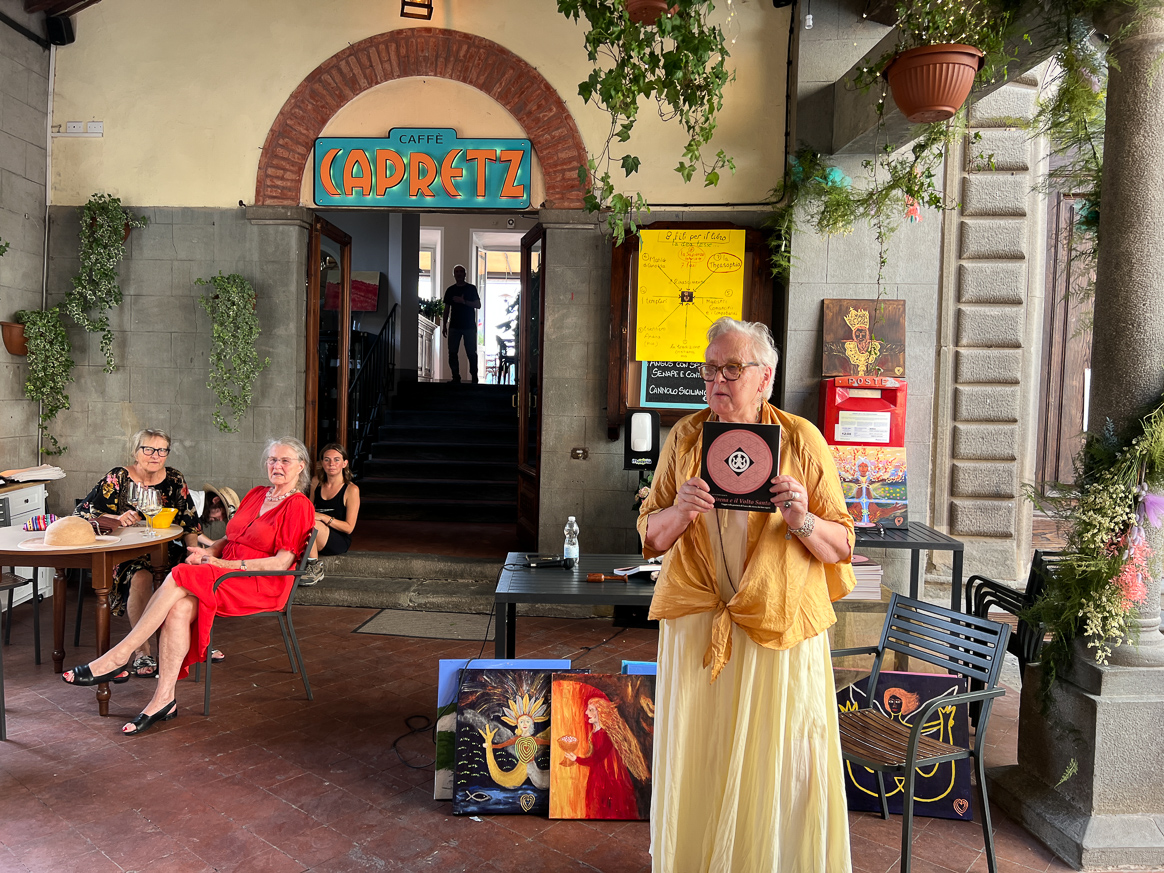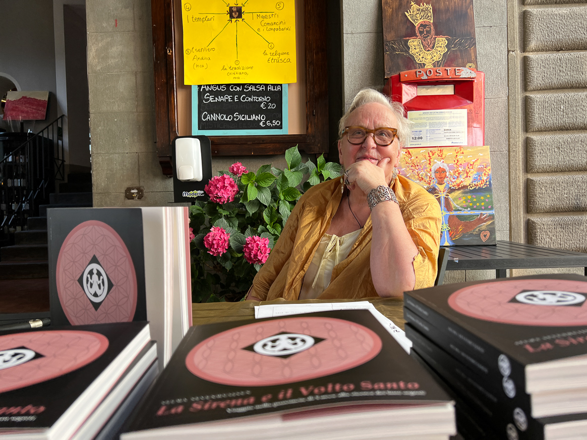 She has already written three book on the subjects, often involving churches, images and stories from this area and this evening at the Cafe Capretz in Barga Vecchia she presented her latest book which has just been published in Italian – la Sirena e il Volto Santo.