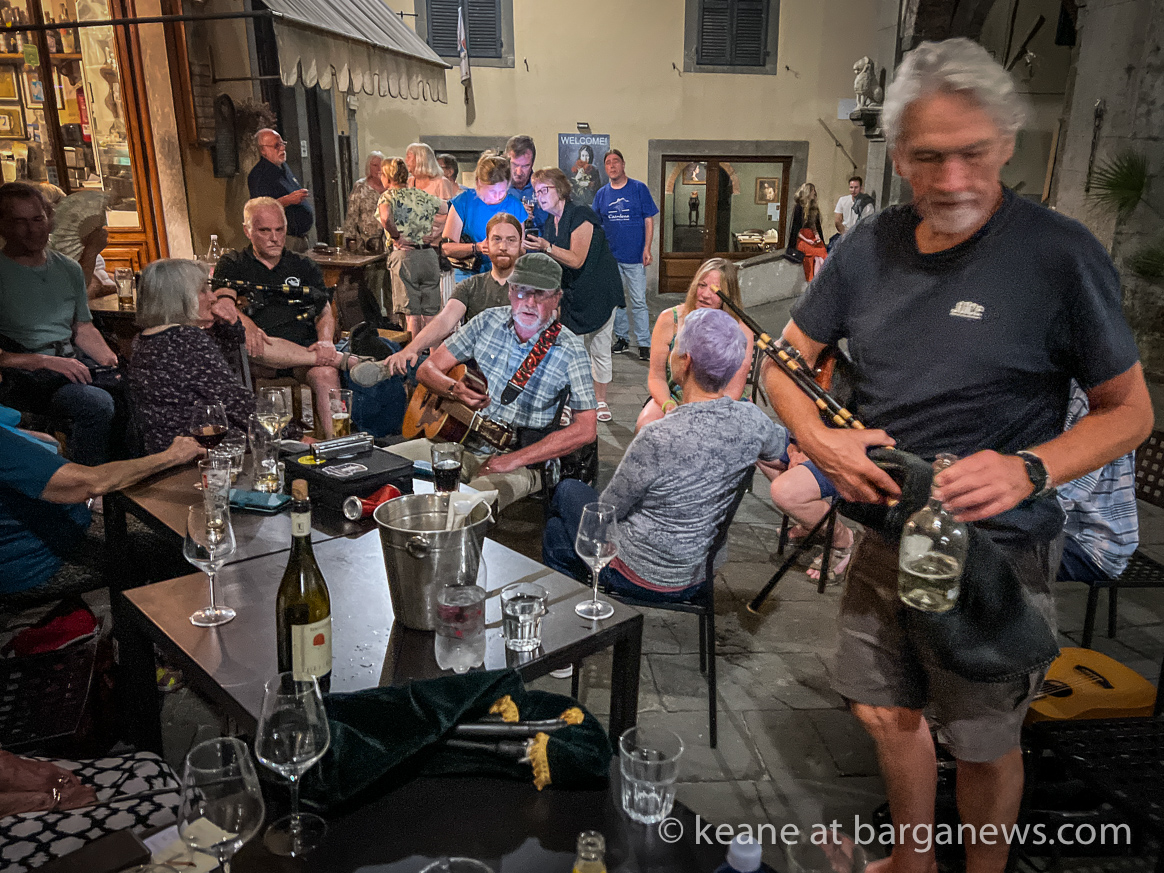 “Barga is full of artists and musicians and creative people of all sorts,” says Moore. “One of the local bars, Aristo’s, is the unofficial cultural centre (site here), and I got involved with music sessions there with my small pipes.”