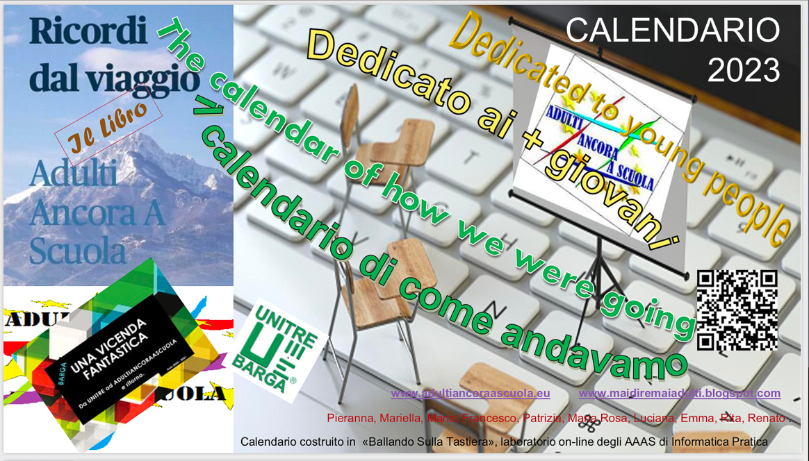 Il Laboratorio Digitale BALLANDO SULLA TASTIERA ha prodotto in Dicembre scorso il Calendario 2023, lavorando on line, negli ultimi giorni è stata redatta la versione in lingua inglese. Con i file scaricabili da questa pagina è possibile condividere e diffondere ovunque nel mondo il Calendario degli AAAS.