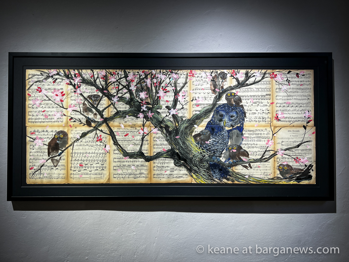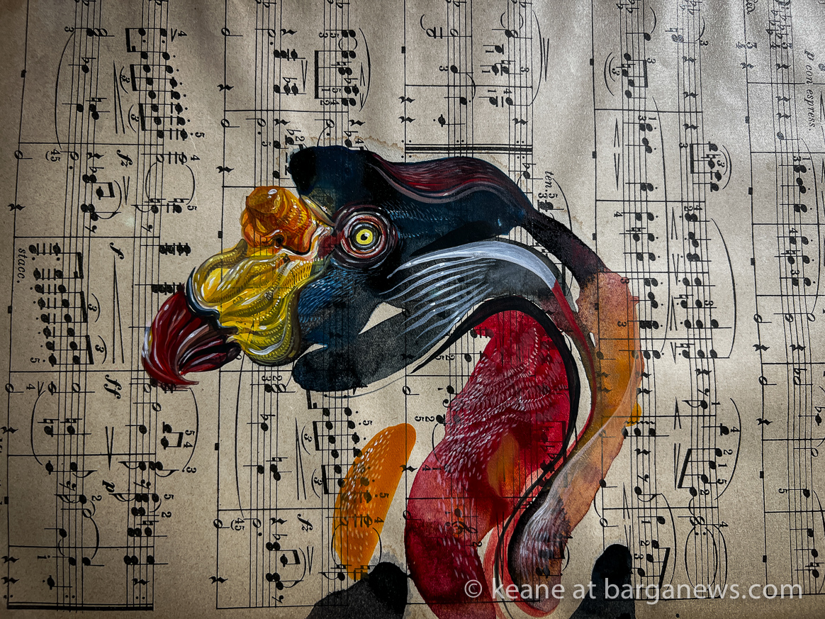 In mostra tra le opere di Hitnes ritroviamo alcuni disegni realizzati su vecchie partiture, uno studio sugli spartiti già presentato in passato al Museo Civico di Zoologia di Roma con il titolo “Pagine Naturalis”: l’artista si ispira a queste melodie per creare ambientazioni naturali e, come un cantore, raccontare delle storie.
