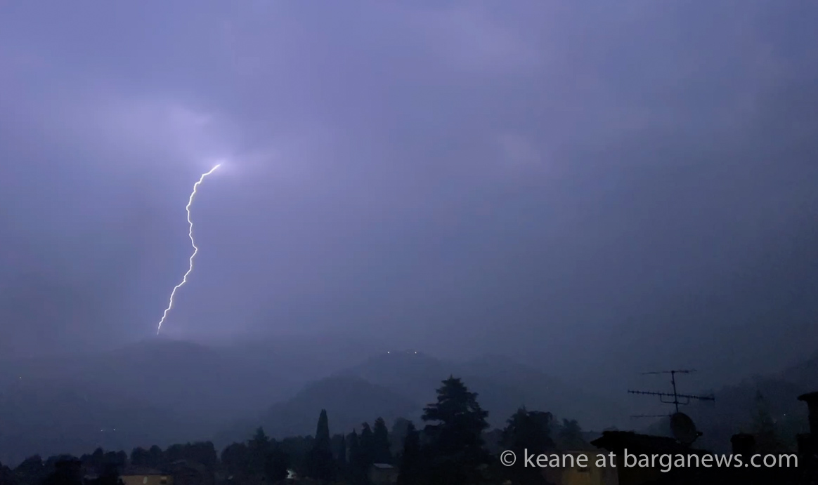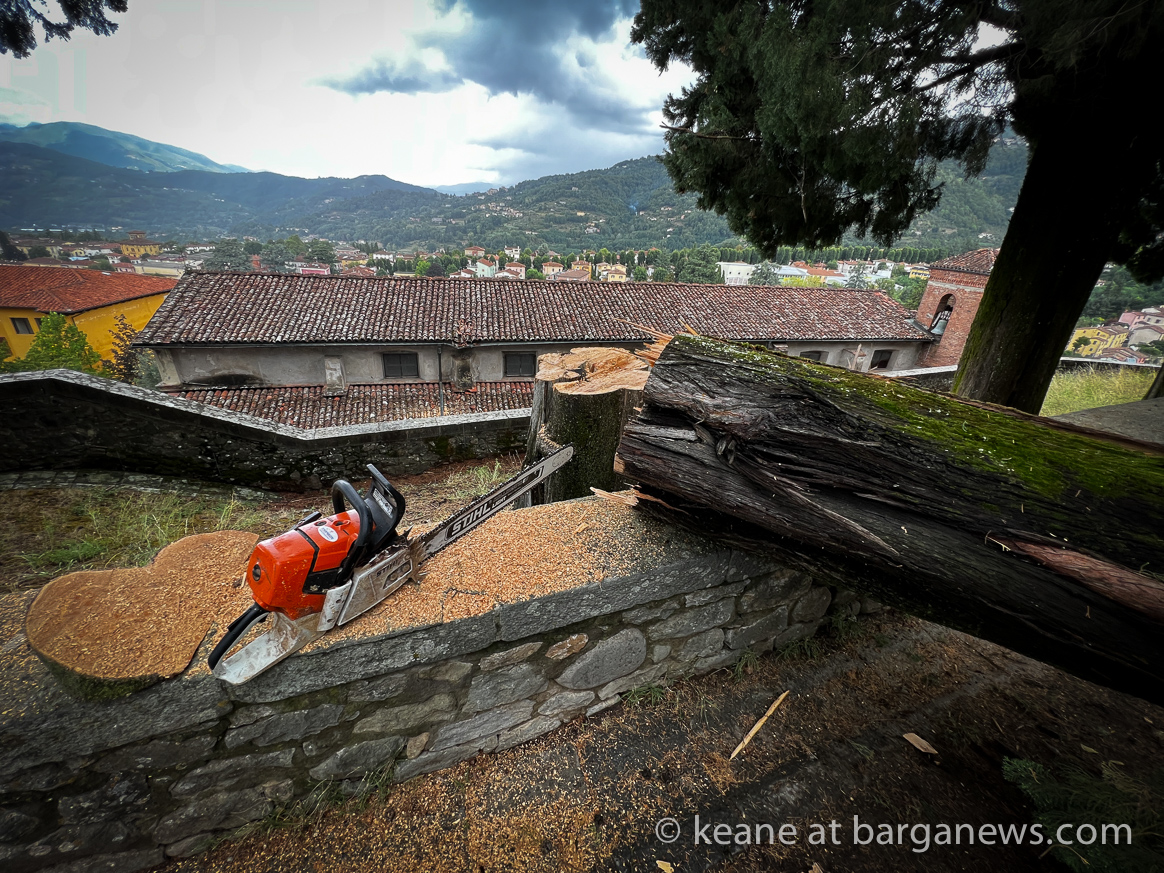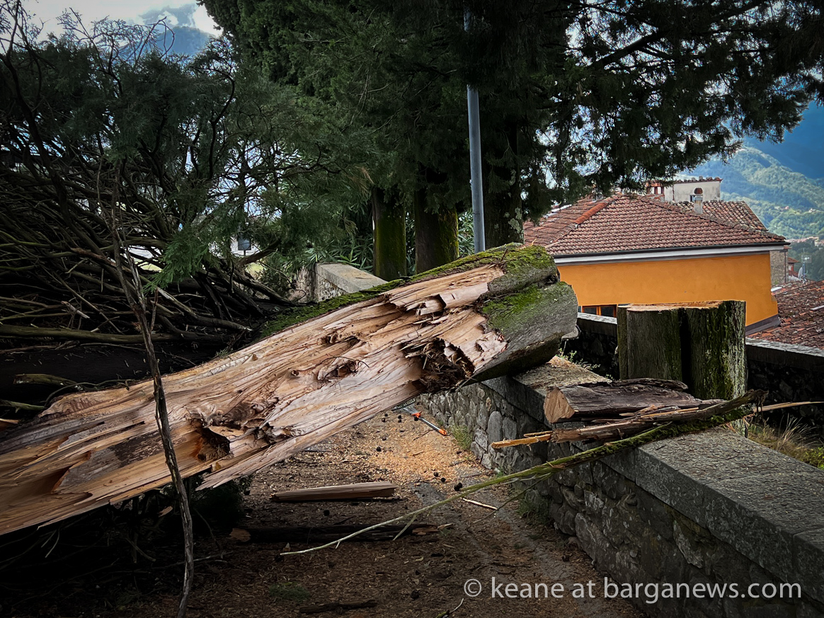Almost 5 cms of rain fell during the night as a large electric storm spread across the area with high winds bringing down part of one of the cypress trees at the Duomo in Barga Vecchia, which fell onto the street below, Via della Speranza, causing damage to a car and the roof of the Crocifisso church.