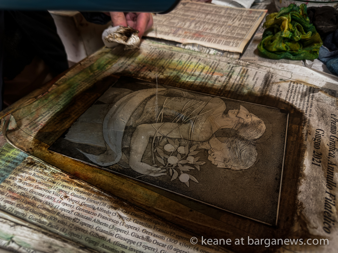 Era infatti un’incisione per una stampa che aveva tirato fuori dai suoi archivi estesi ed era stata stampata per l’ultima volta come regalo di nozze per una coppia di amici suoi 35 anni fa.
