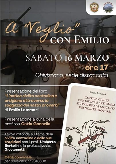The Comune of Coreglia, together with the group of Nebbiana, Nebbianella, and Val di Lago di Barga, organised this Saturday, March 16th at Ghivizzano the event “A ‘Veglio’ with Emilio” featuring the presentation of the book “The ancient peasant and artisan civilisation through the wisdom of our proverbs,” written by Emilio Lammari.