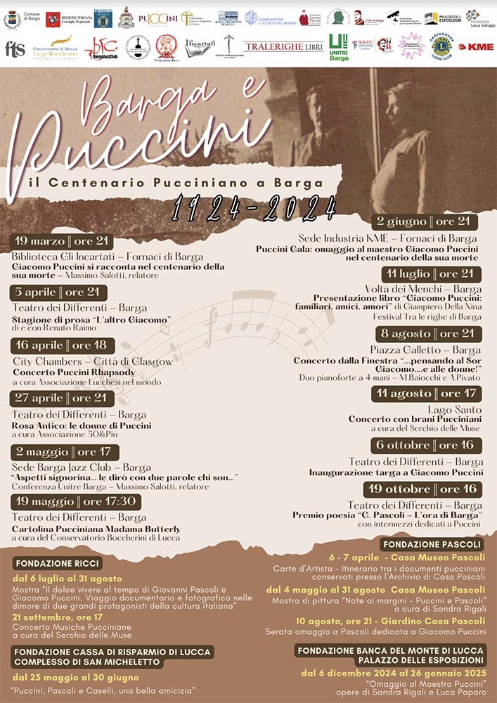 The calendar is a collaboration between the Municipality of Barga, Tuscany Region, Province of Lucca, City of Glasgow, National Committee for Puccini Celebrations, Cassa di Risparmio di Lucca Foundation, Banca del Monte di Lucca Foundation, Ricci Foundation, Giovanni Pascoli Foundation, Association of Lucchesi in the World, Giacomo Puccini Foundation Lucca, Simonetta Puccini Foundation for Giacomo Puccini, Exhibition Palace, Lucca Development Foundation, Tuscany Show Foundation non-profit, “L. Boccherini” Music Conservatory, Barga Jazz Club,