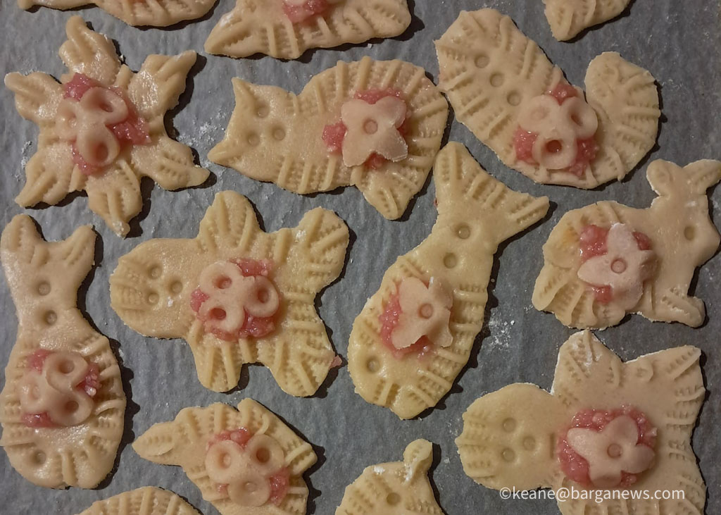 Once the dough has rested, roll it out with a rolling pin to an even thickness. Cut out shapes of your choice—stars, hearts, or festive figures work beautifully. Use metal tweezers to pinch decorative patterns along the edges of each biscuit, leaving space in the centre for the marzipan filling. Place a dollop of marzipan in the middle and adorn the biscuits with additional dough cut into small, leaf-like shapes.