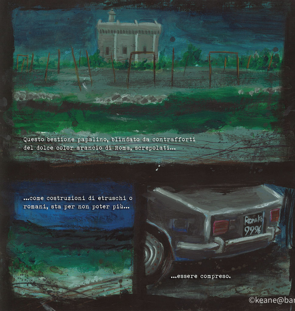 The dialogue and captions draw directly from Pasolini’s Poesia in forma di rosa (1964), weaving verses from the poem Una disperata vitalità and La Guinea into stark visual sequences. Giusti’s brush captures desolate suburbs, headlights, and violence beneath a sickly sky — a visual requiem for the poet’s anguish and clairvoyance.