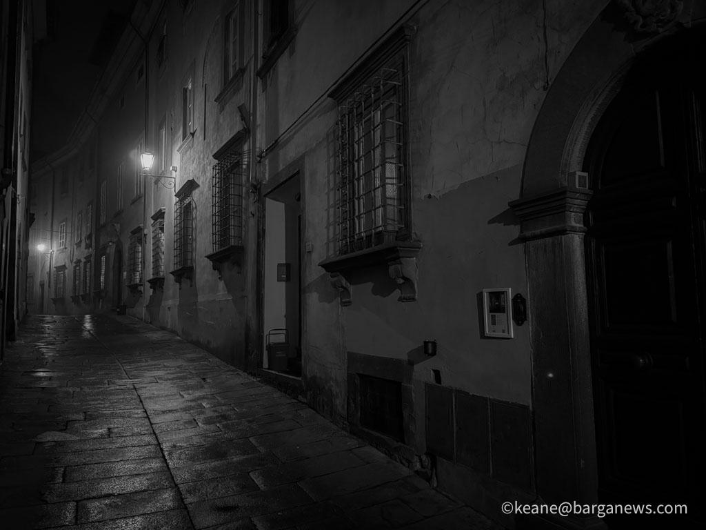 Le strade strette del centro storico sembrano più lunghe e più chiuse in queste condizioni. Gli angoli scompaiono nella foschia. Porte e finestre compaiono per un attimo sotto i lampioni, per poi rientrare nell’ombra.