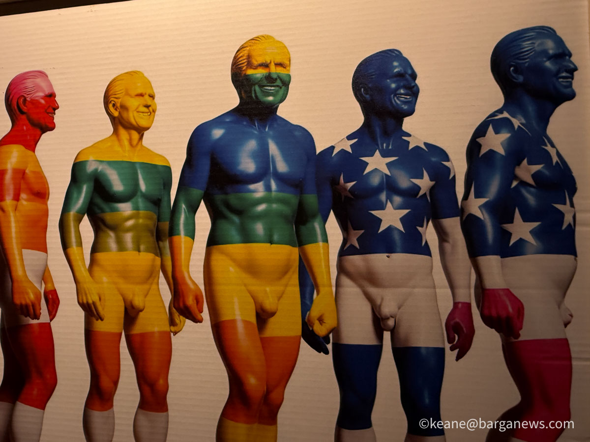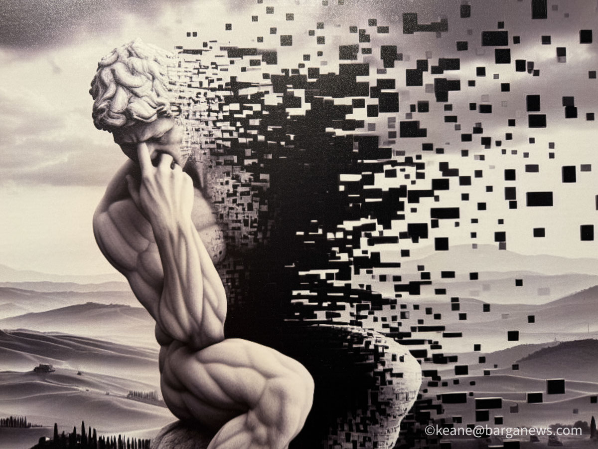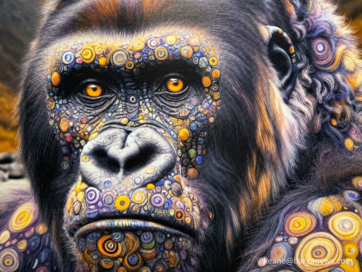 Several pieces introduce a direct contrast between organic and mechanical forms. A torso opened to reveal internal machinery sits alongside works in which the human figure appears to dissolve into pixels or abstract fragments. Elsewhere, animal imagery—such as a highly detailed primate face—draws attention to observation and recognition, inviting a slower, more attentive reading.