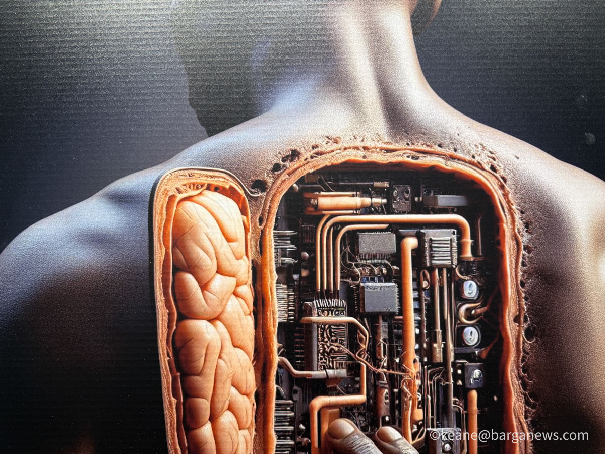 Diverse opere mettono in evidenza un contrasto diretto tra forme organiche e meccaniche. Un torso aperto che rivela una struttura interna fatta di ingranaggi e circuiti si affianca a lavori in cui la figura umana sembra dissolversi in pixel o frammenti astratti. Altrove, la presenza di immagini animali — come il volto estremamente dettagliato di un primate — richiama l’attenzione sull’osservazione e sul riconoscimento, invitando a una lettura più lenta e attenta.