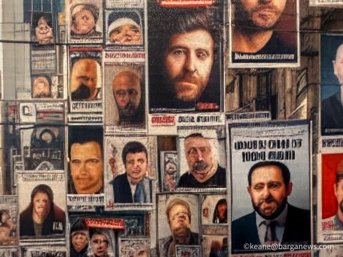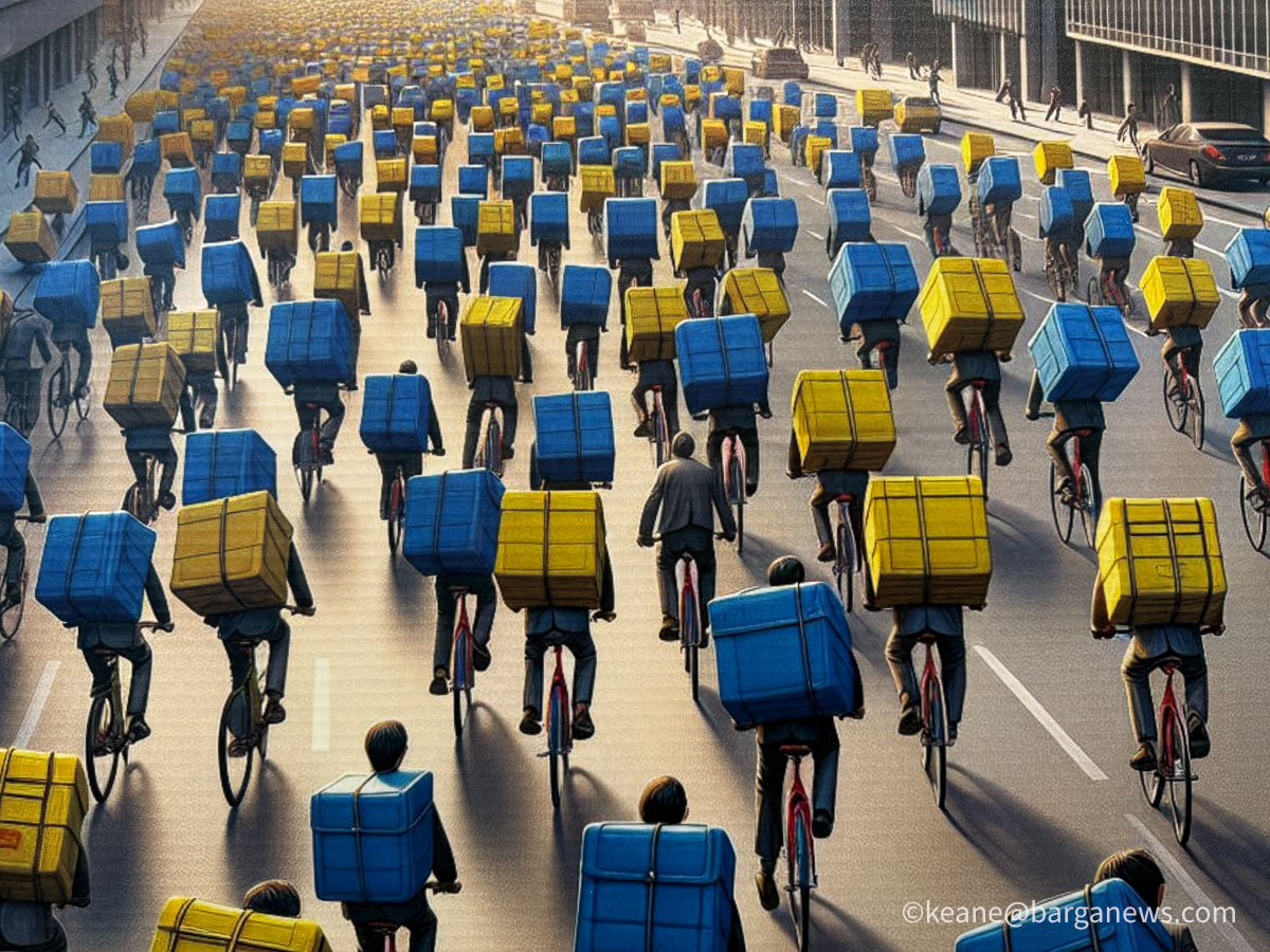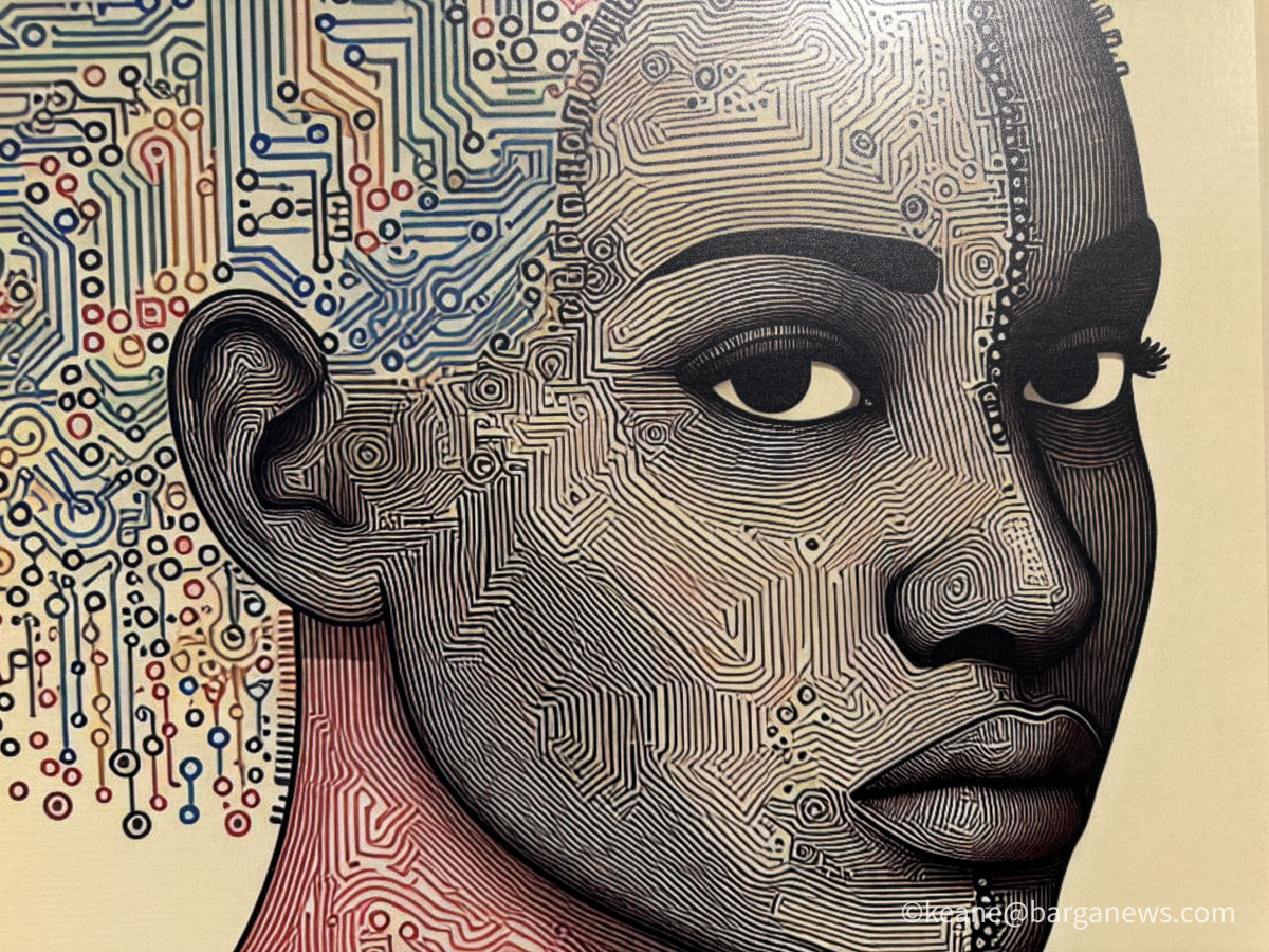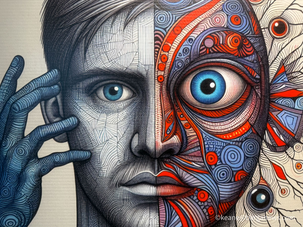 The images themselves move across a wide visual range. Some works focus closely on the human face, fragmented and reassembled through patterns, circuitry and layered marks that suggest both biological and digital systems. Others expand into broader scenes: an urban street lined with repeated portraits, or a procession of figures carrying identical burdens through a city space. Across the series, there is a consistent interest in repetition, duplication and the ways in which images accumulate meaning over time.