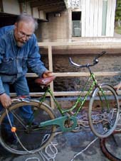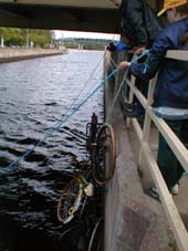 The bikes started to come to the surface one by one. Then other objects started to appear from the dark waters; sign posts and even a money box. Rumours circulated of a bank robbery a number of years ago and the empty money boxes then thrown from the bridge into the canal. The bikes are once again on dry land back to main bike index