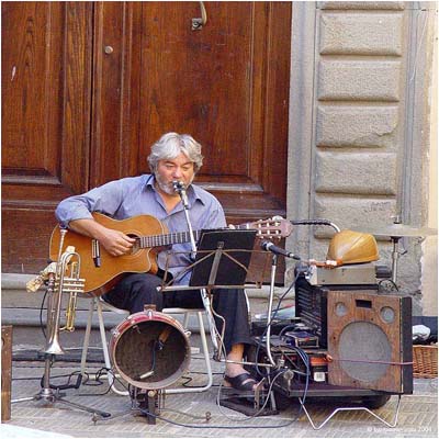 A one man band in the main piazza in Barga this afternoon kept the audience entertained with his incredible skills keeping a guitar, mandolin, trumpet plus brass drum and high hat cymbals all going together in time and in perfect harmony -- Francesco D'Angelo, look out for that name, it is one to remember.
