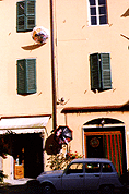 the stone street and green wooden shutters. They are surprised