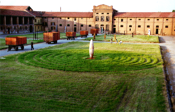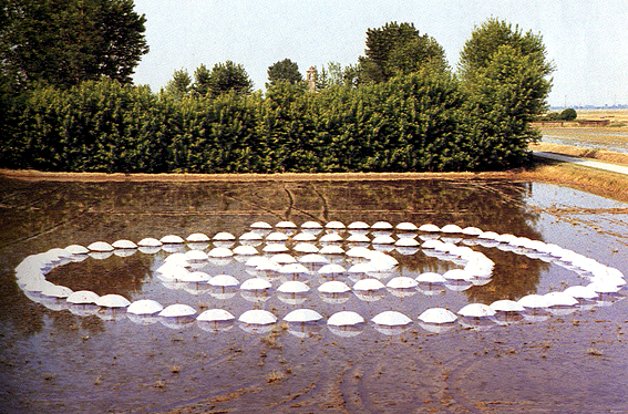 100 umbrellas in a rice field outside of the rice farm forming a celtic spiral. The same spiral mirrored inside the rice farm cut into the grass - Vercelli Italy