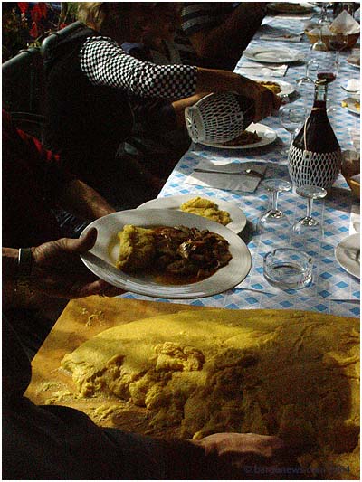 those people who have discerning taste buds. This year has been a wonderful autumn with the bright sunny clear days, cool nights and just the right amount of rain to bring a bumper crop of the finest porcini mushrooms anywhere in europe. Add to that some fine home ground polenta from Ceserana and you have the perfect dish; polenta and porcini. This morning 6 members of the Barga Band sat down to eat with a dozen close friends a superbly prepared dish of the afore mentioned delicacies. The table was prepared at Bar Sport by the ever hospitable Franco (with some sterling help in the kitchens from his mother, and a certain trumpet player well known the area for other activities to do with enjoyment at the table. What better way to spend a Saturday lunchtime as the season draws to a close but with good friends and great food. What was once the food of the poor has become the food of the fortunate. Anyone who was seated at the table this morning should count themselves as very, very lucky to partake in such a simple, honest and tasty meal. Well done Franco and all those concerned. . |