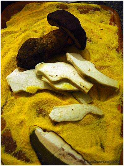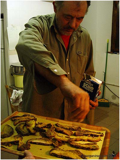 | What better way to spend an afternoon in October than by a trip up the mountainside to the Alpino Refugio "Giovanni Santi" which sits in amongst the beech trees at over 1300 metres above sea level. We were there to sample the delicacy of the season, freshly picked porcini mushrooms specially prepared by the host and chef of the refugio, Bino. Sliced, dusted with cornflour, a pinch of salt and lightly fried with a crisp outside yet keeping the inside succulent, moist and fragrant ... there is nothing else in this world that comes close to Porcini mushrooms from this area. The