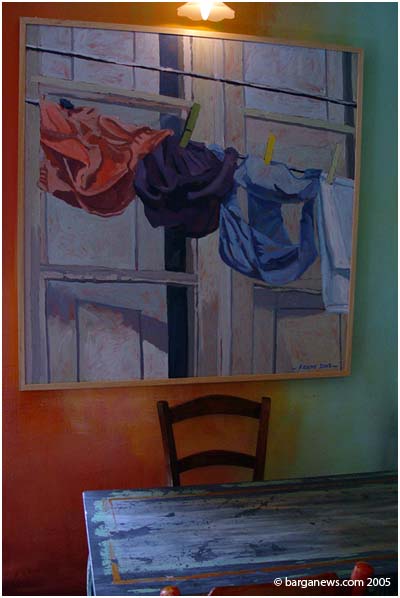 What you notice, before anything else, is that the subjects of Keane`s brush have an unlikely beauty. They are banners aflutter in the shifting Garfagnana winds, their allegiances announced in the language of high art: color, form, composition, kinetic tension. Their subtext is the wonderful diversity of human experience, ranging from the dizzyingly erotic to the downright practical, and capturing, as graphically as could be imagined, our collective journey from infant to elderly. Mutande, their Italian name, is derived from the verb mutare, "to change" -- and it seems far closer to the remarkably dignified spirit of these paintings than its giggling English equivalent, "knickers."